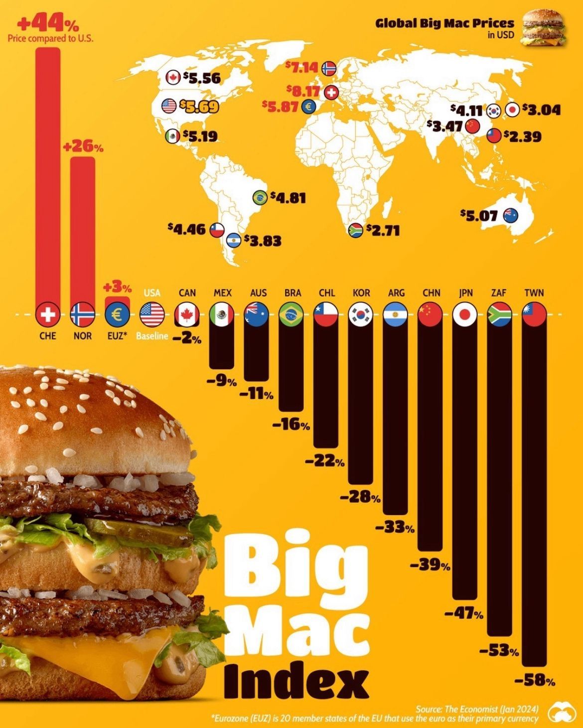 💡 Um termômetro econômico: Mais do que uma comparação de preços de hambúrgueres, o Big Mac Index reflete os custos de produção, salários locais, e até as políticas fiscais de cada país, mostrando as condições econômicas globais de maneira simplificada. Economistas usam esse índice para ver rapidamente as diferenças de poder de compra.